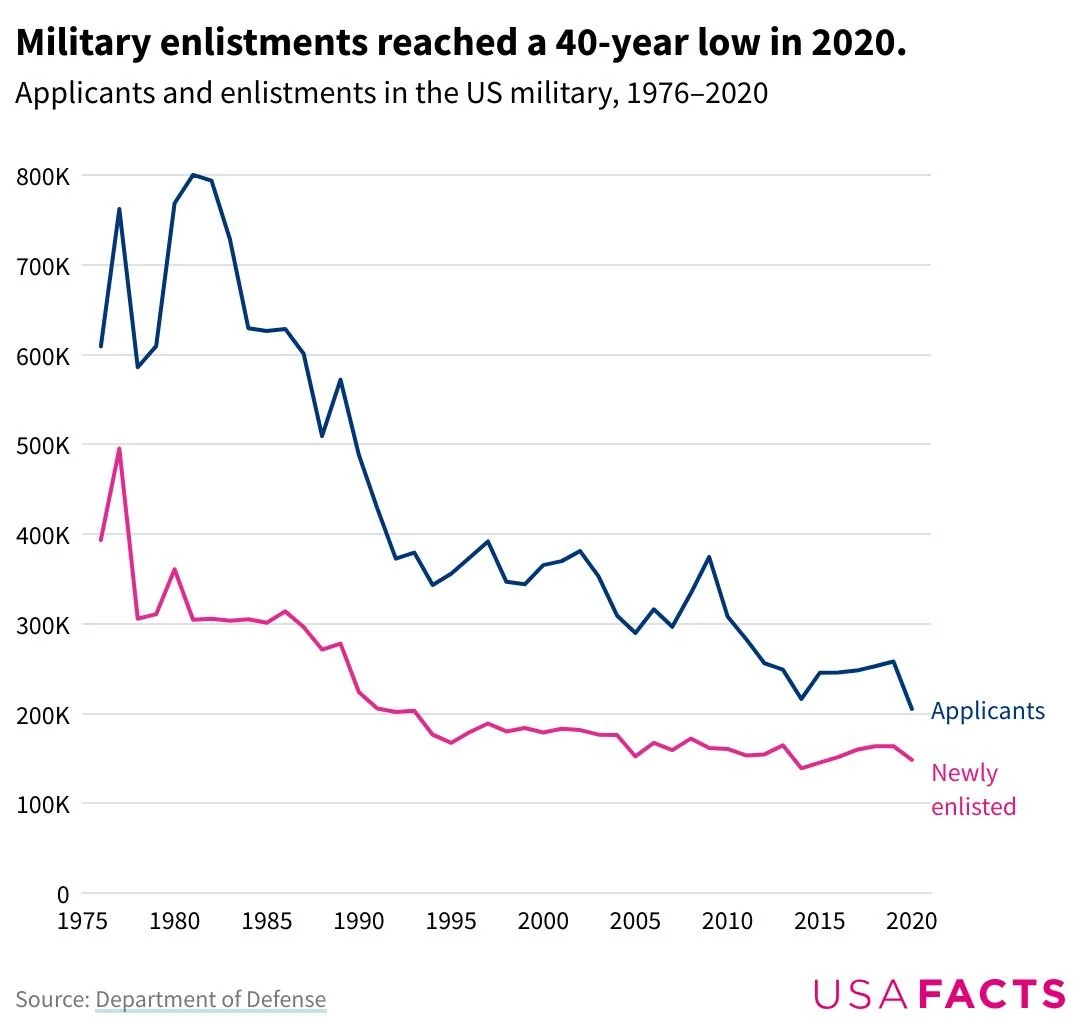 Image of a line chart showing changes over time of applicants and enlistments in the U.S. military.